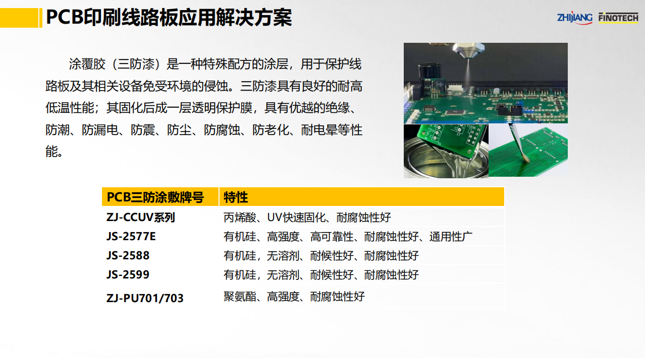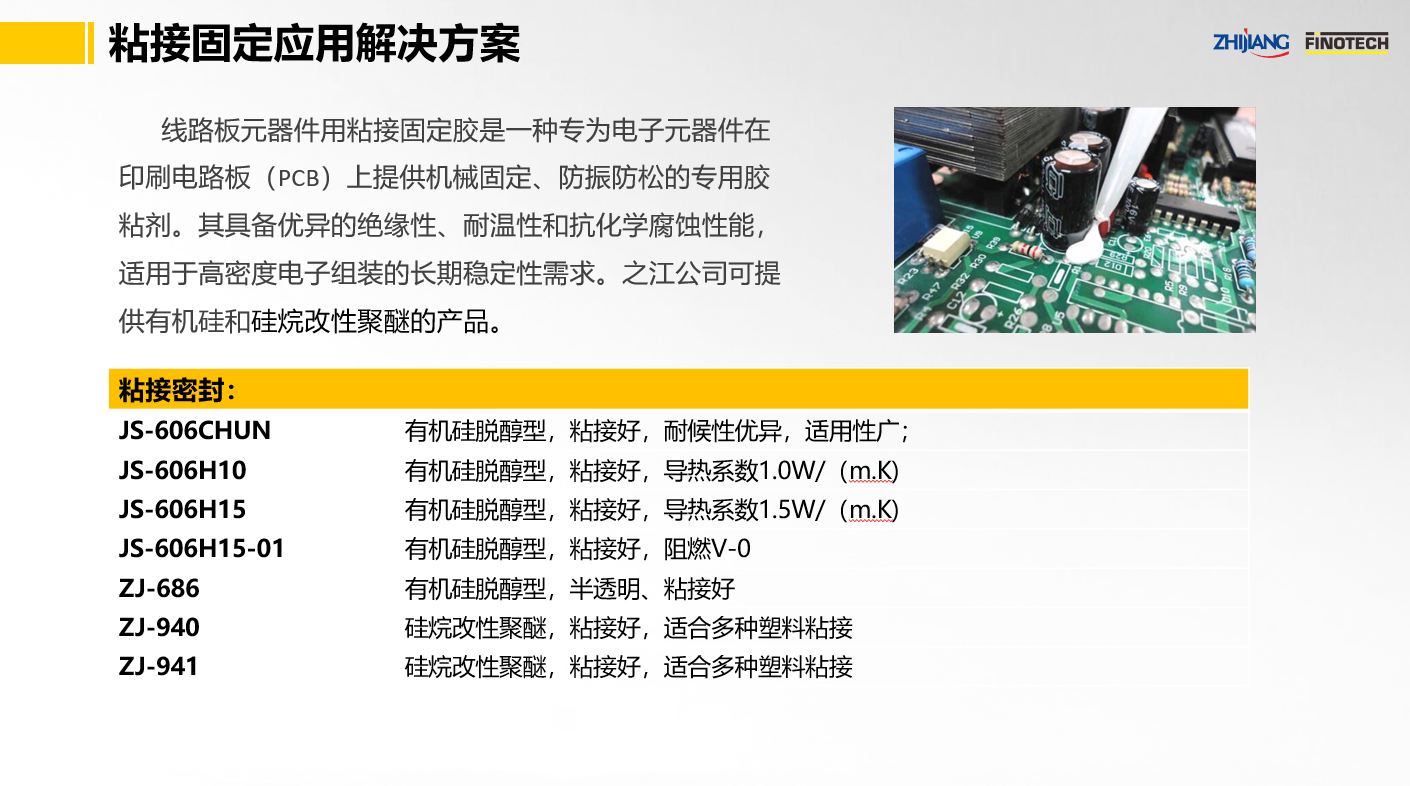 之江公司立足于中國膠粘劑行業(yè)領(lǐng)軍企業(yè)和有機硅、聚氨酯、環(huán)氧等專業(yè)膠粘劑的創(chuàng)新和產(chǎn)業(yè)化優(yōu)勢,具有國家高新技術(shù)企業(yè)和國家級企業(yè)技術(shù)中心資質(zhì),依靠國家級CNAS實驗室以及國家級博士后科研工作站,并有國際專家助力,為PCB印刷線路板的三防涂敷、粘接固定、導(dǎo)熱灌封等提供系統(tǒng)用膠解決方案。其中,關(guān)鍵產(chǎn)品如下: