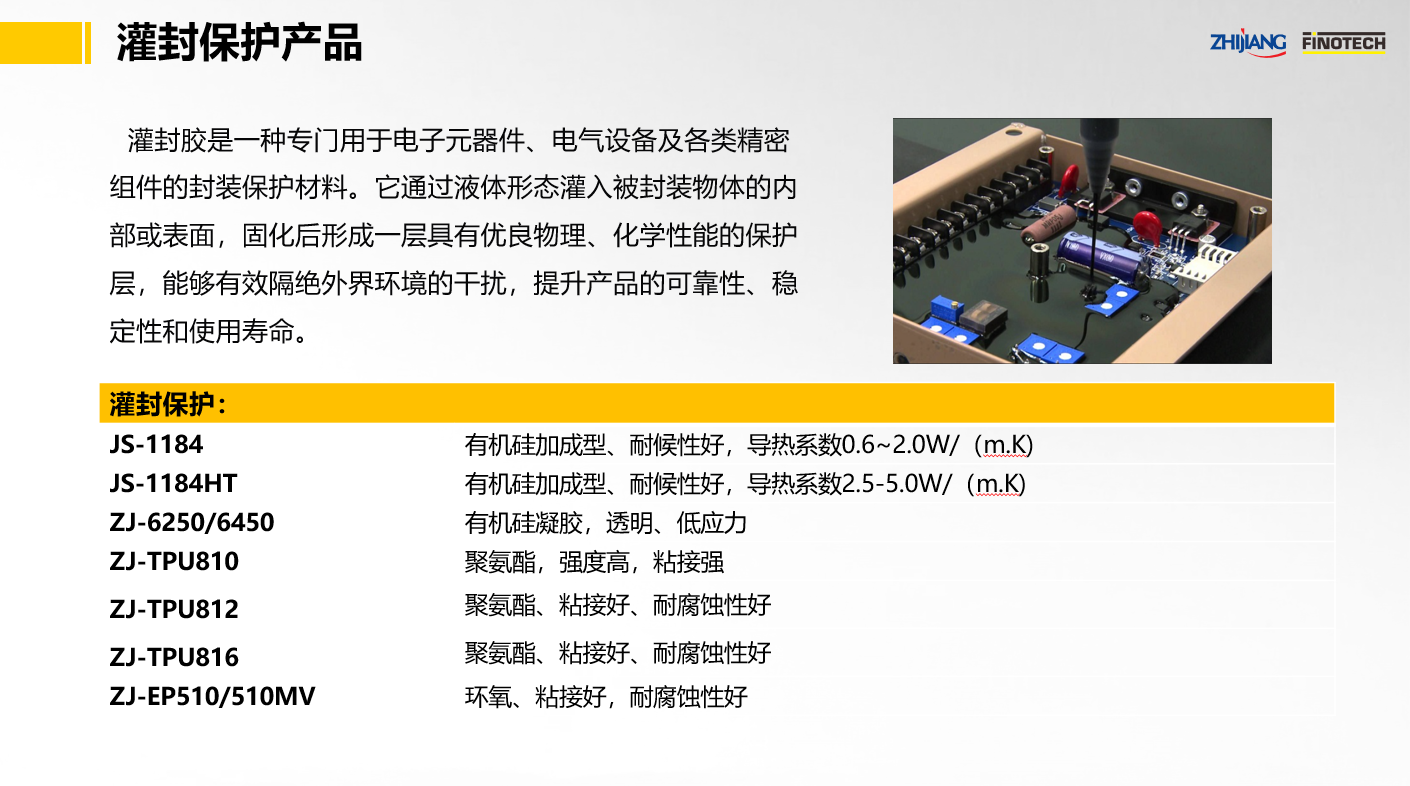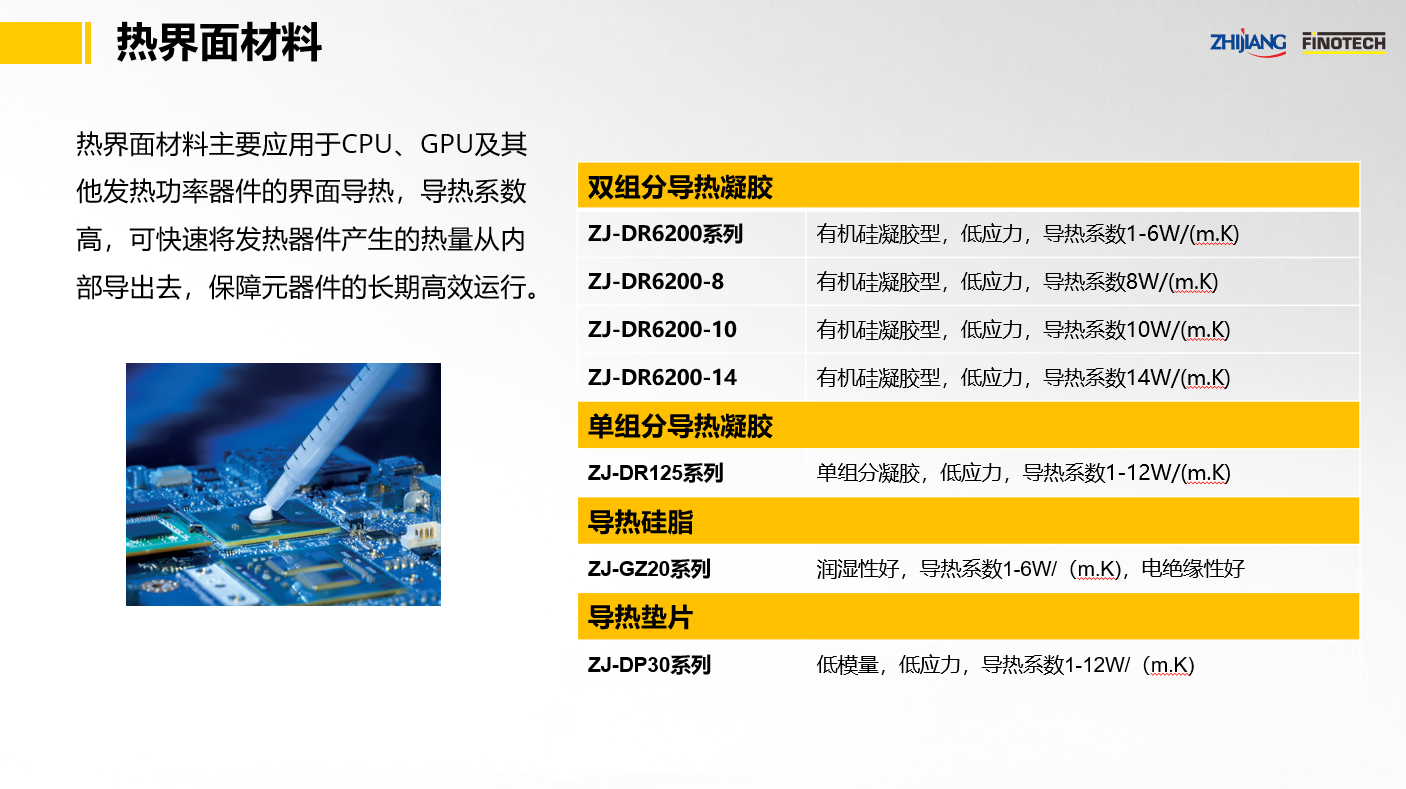 ZJ-DR6200系列(雙組分導(dǎo)熱硅凝膠)、ZJ-DR125系列(單組分導(dǎo)熱硅凝膠)ZJ-GZ20系列(導(dǎo)熱硅脂)、JS-1184系列(有機硅導(dǎo)熱灌封膠)