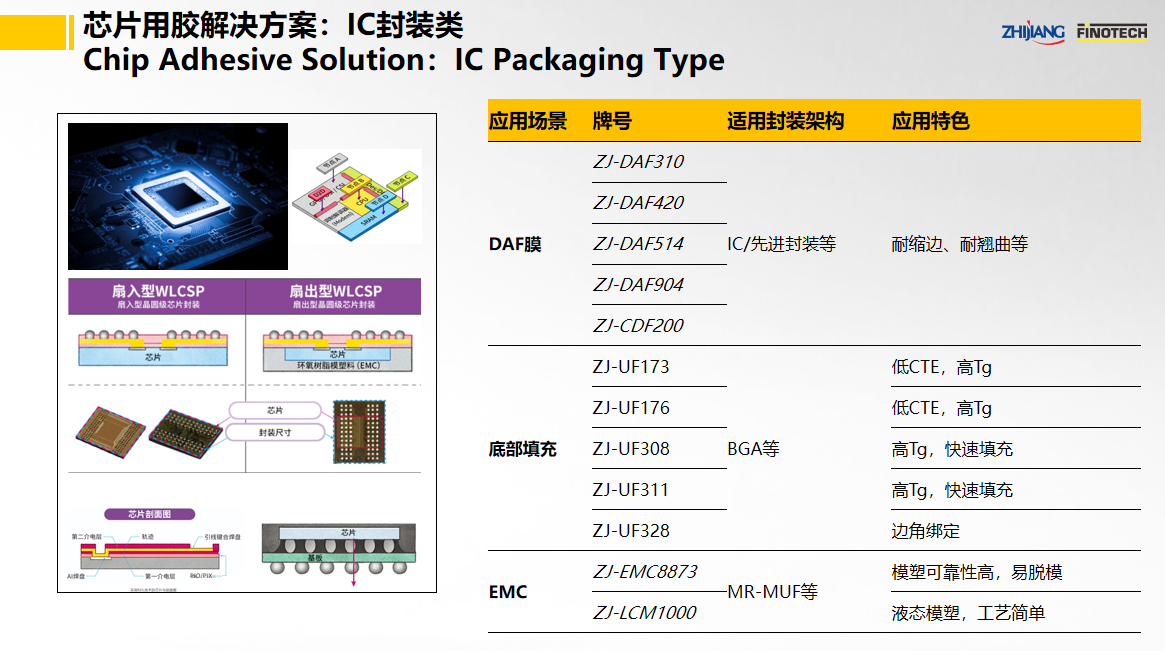 之江公司立足于中國膠粘劑行業領軍企業和有機硅、聚氨酯、環氧等專業膠粘劑的產業化優勢,具有國家級高新技術企業和國家級企業技術中心資質,依靠國家級CNAS實驗室以及國家級博士后科研工作站,并有國際專家助力,為半導體封裝行業提供高性能的芯片粘接和封裝解決方案。其中,關鍵產品如下: